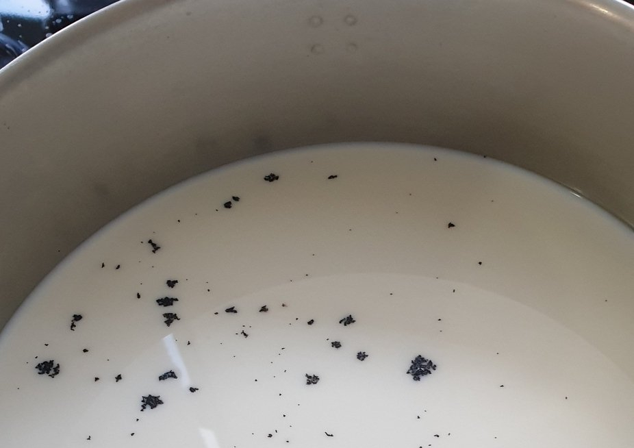 Faire bouillir dans une casserole le lait avec la gousse de vanille fendue en deux (dans le sens de la longueur).