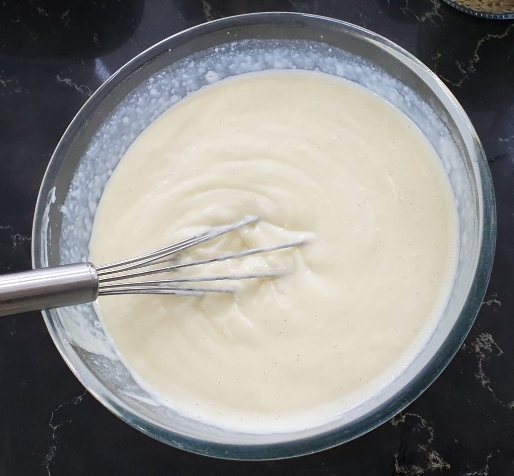 Dans un bol à part, mélanger la maïzena, les oeufs bien battus auparavant et l’édulcorant. Une fois le mélange bien homogène verser le lait qui a bouillit dessus doucement (moi je le fait en deux fois) bien remuer pendant 2 minutes.