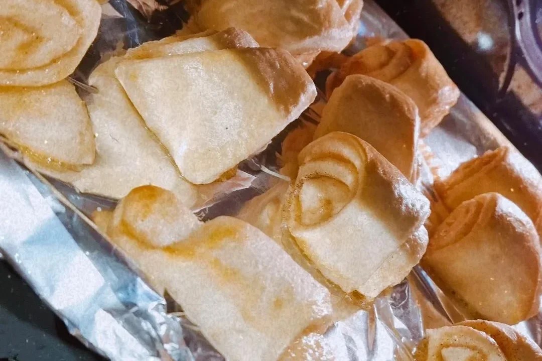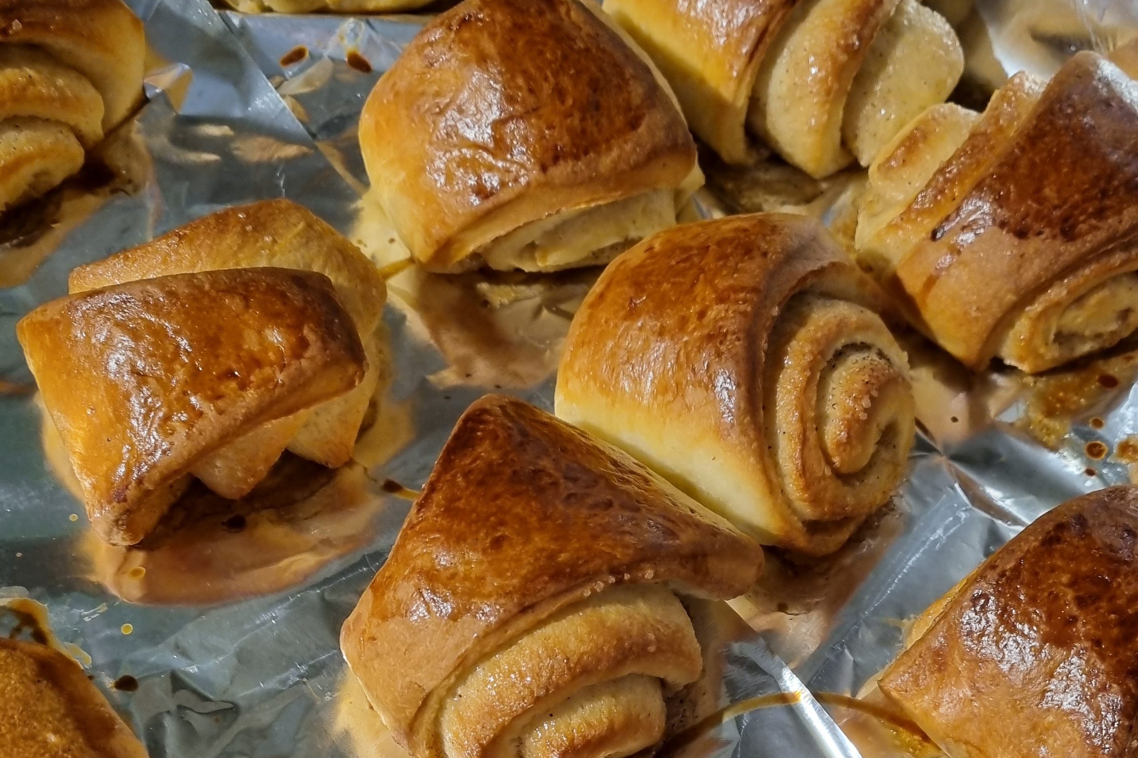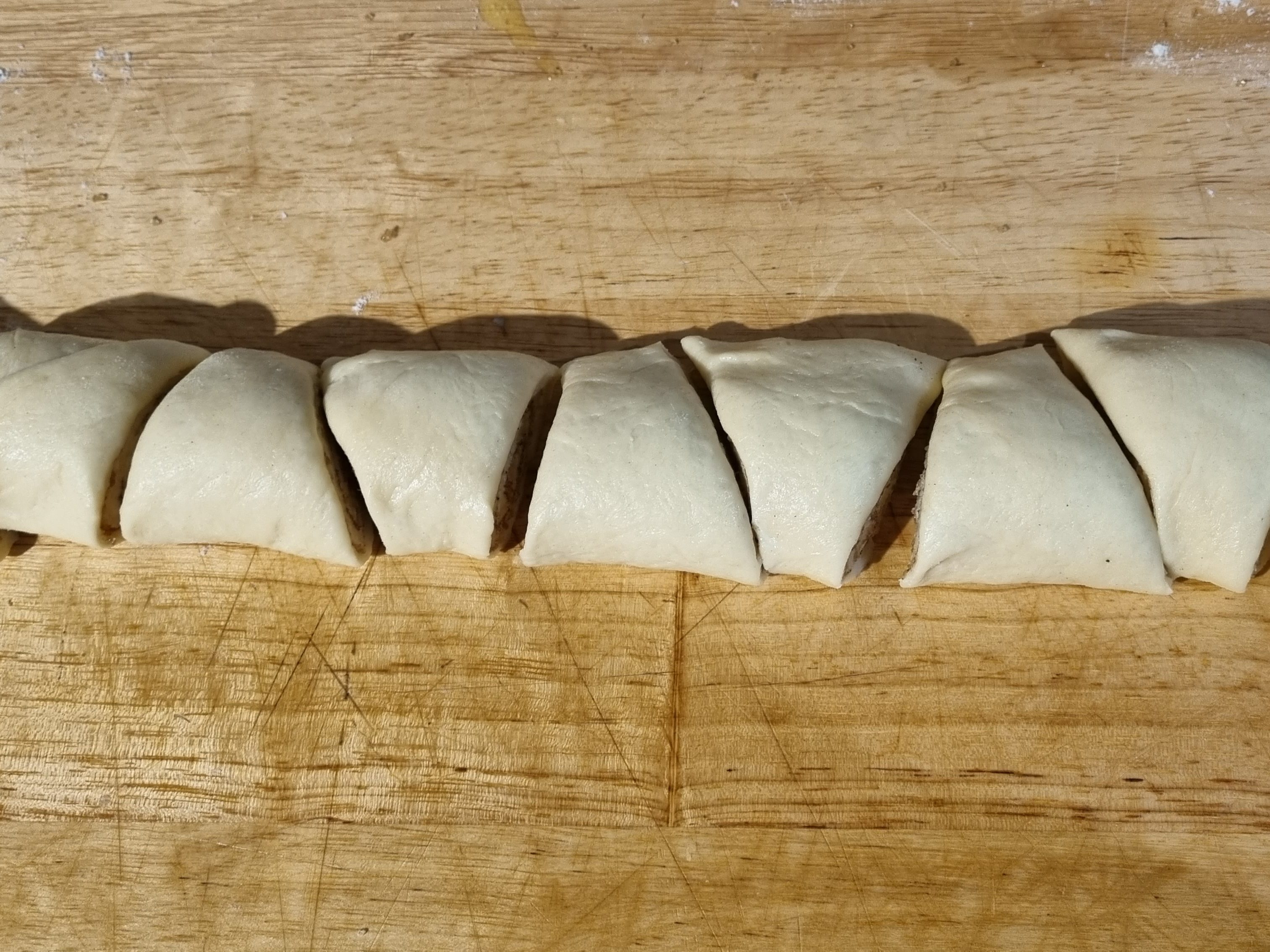 Sur une feuille de papier sulfurisé disposer chaque triangle et aplatir légèrement la pointe des Kanelbullars de façon à faire ressortir un peu la garniture.
